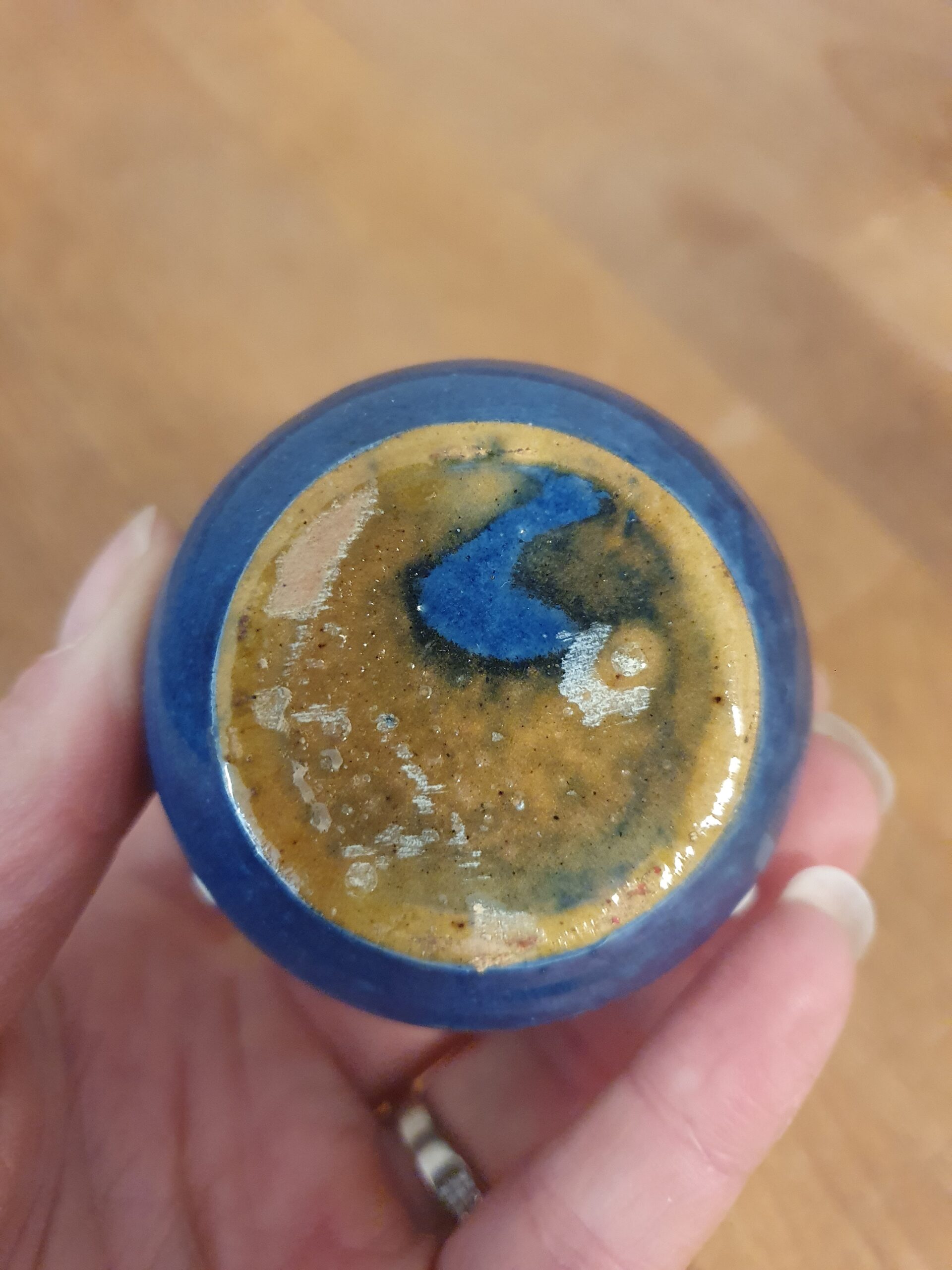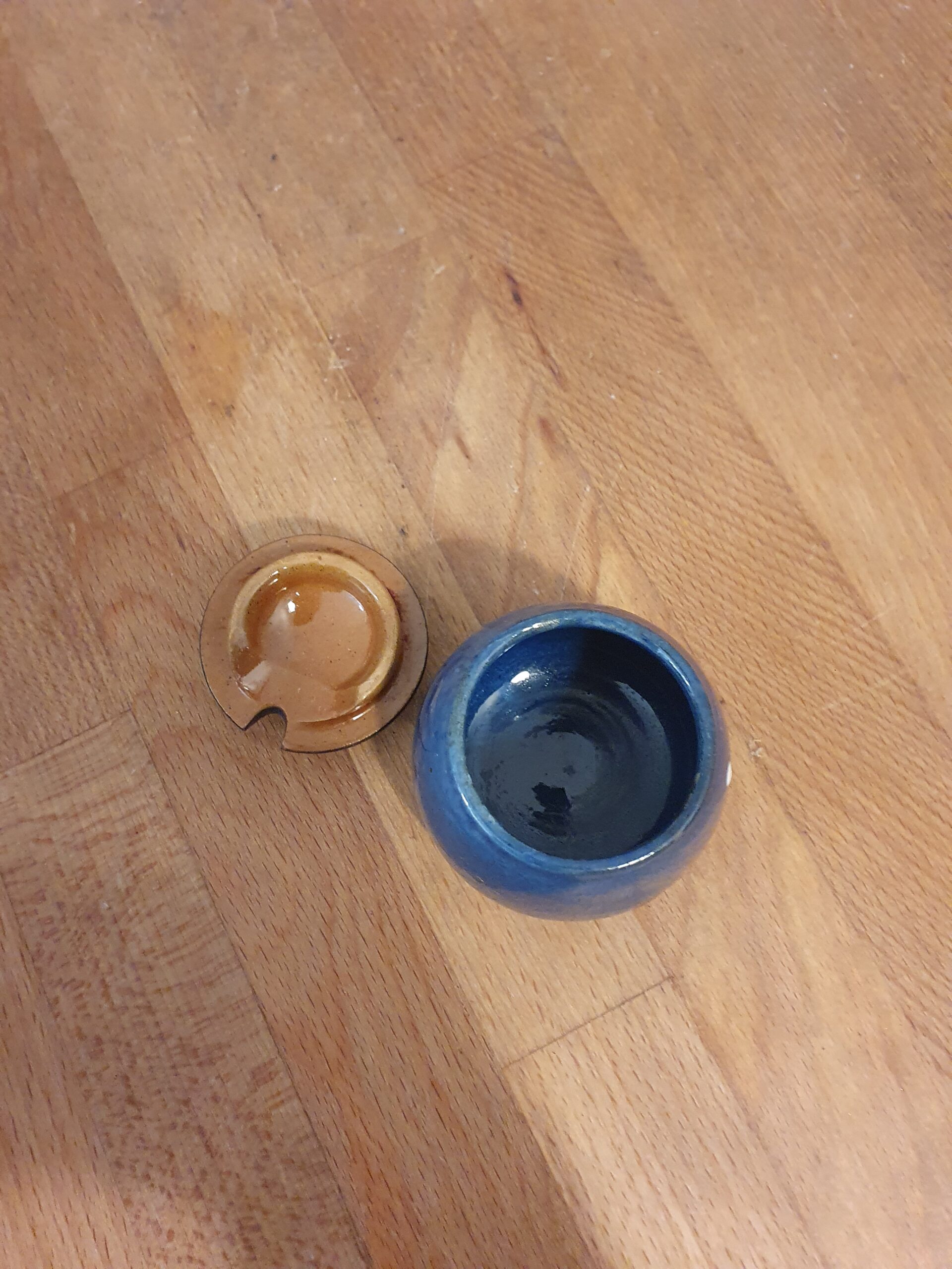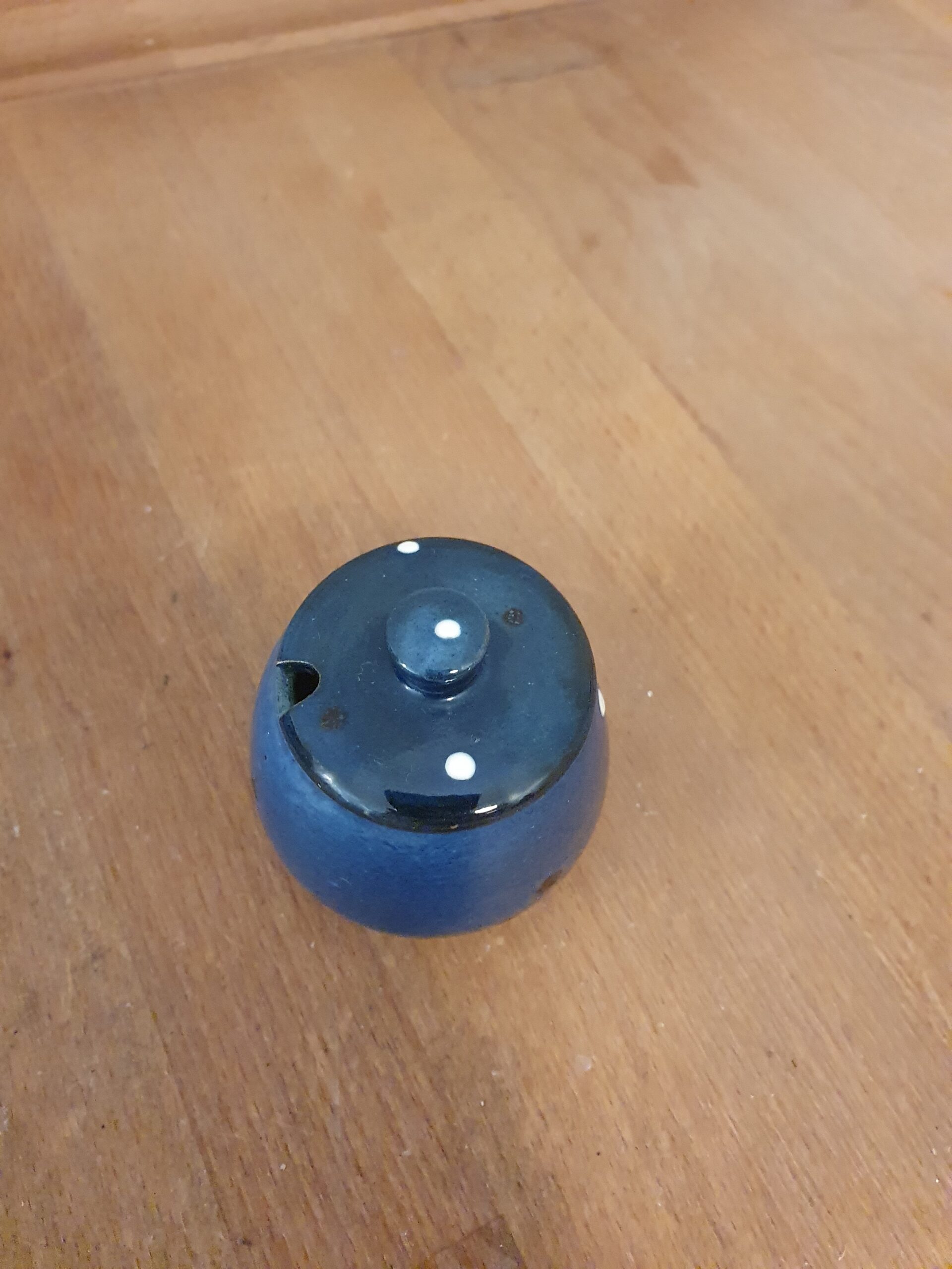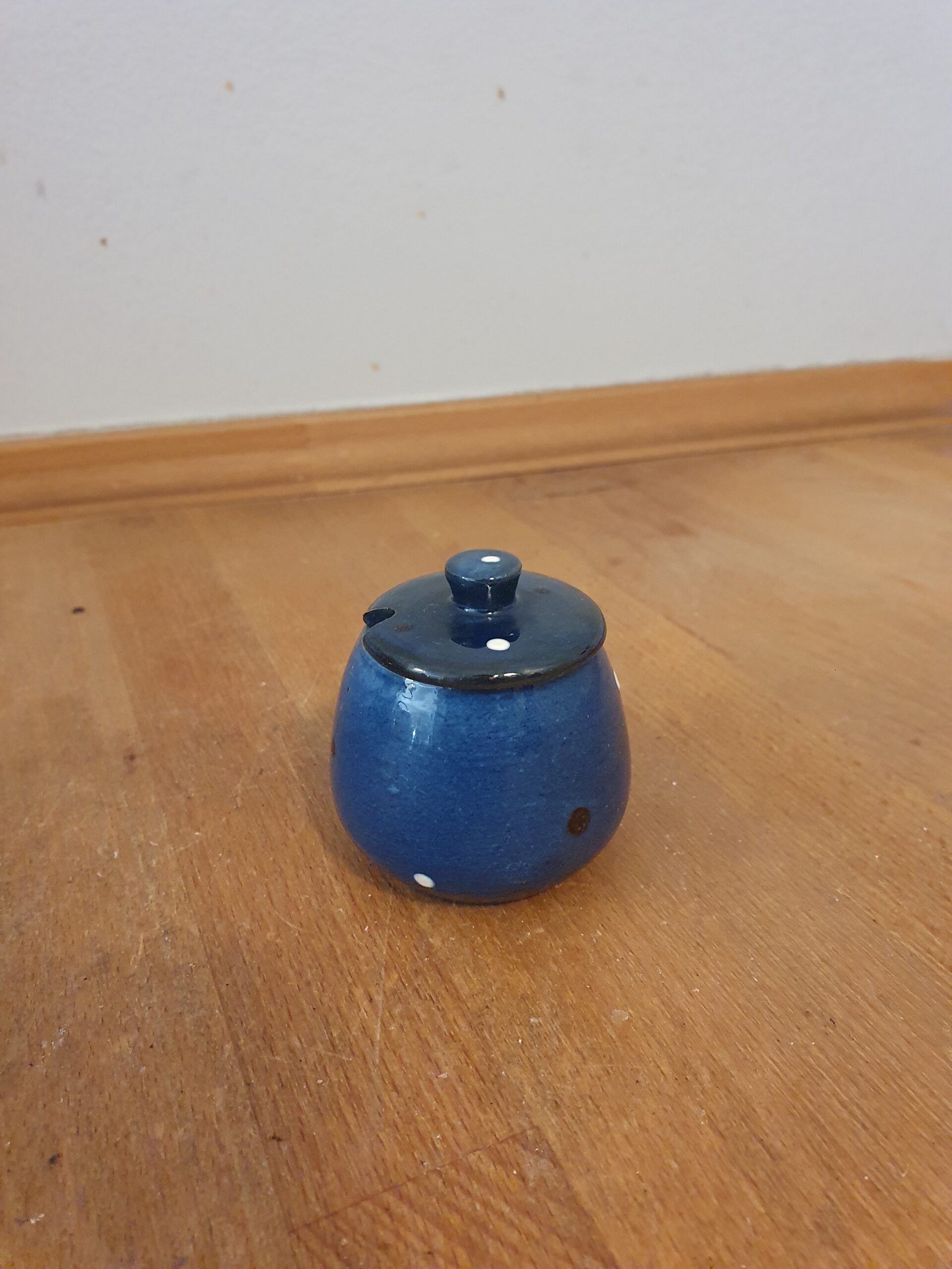 Lille krukke med pletter i keramik.